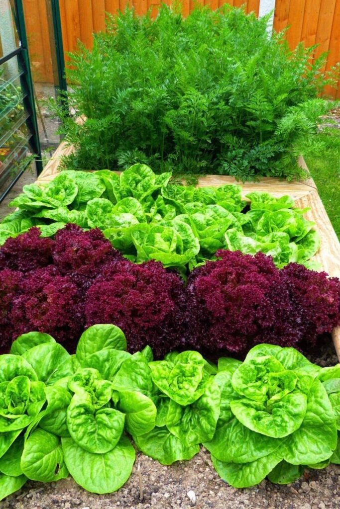 A layered planting style gives leafy crops plenty of airflow, helping them stay crisp and healthy while filling the raised bed neatly.