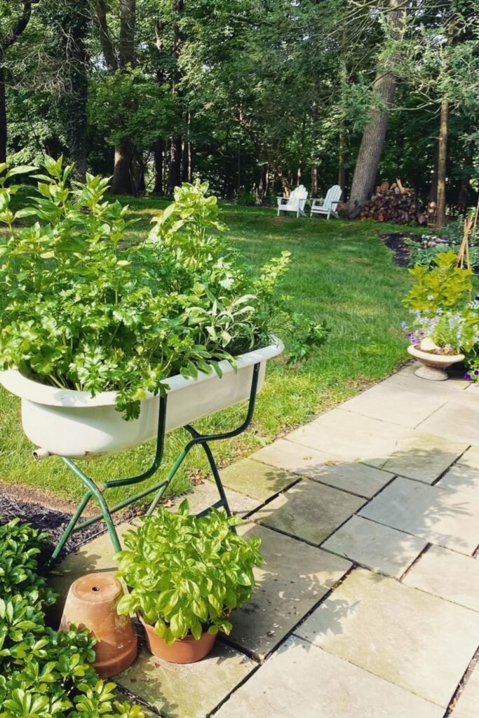A reused metal tub becomes a simple raised herb planter, giving roots deep soil and keeping plants cool during warm summer days.