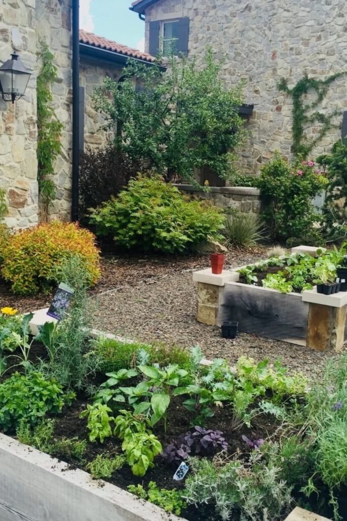 A raised bed in a courtyard space creates a focused planting zone, giving herbs steady warmth from surrounding stone walls.