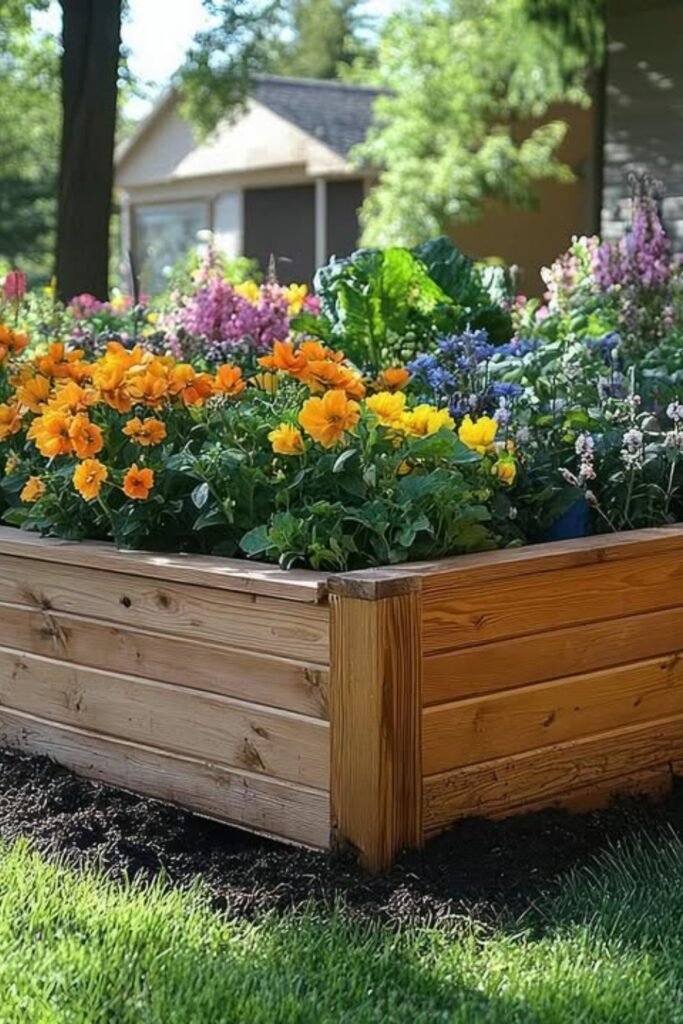 A wooden raised bed filled with colorful plants offers a lively focal point while giving herbs plenty of steady sunlight.