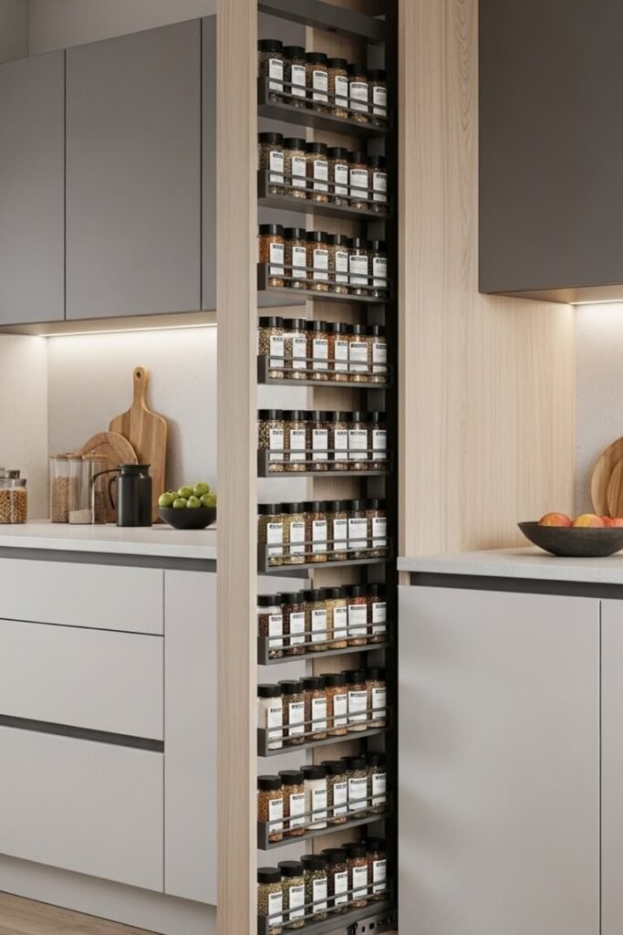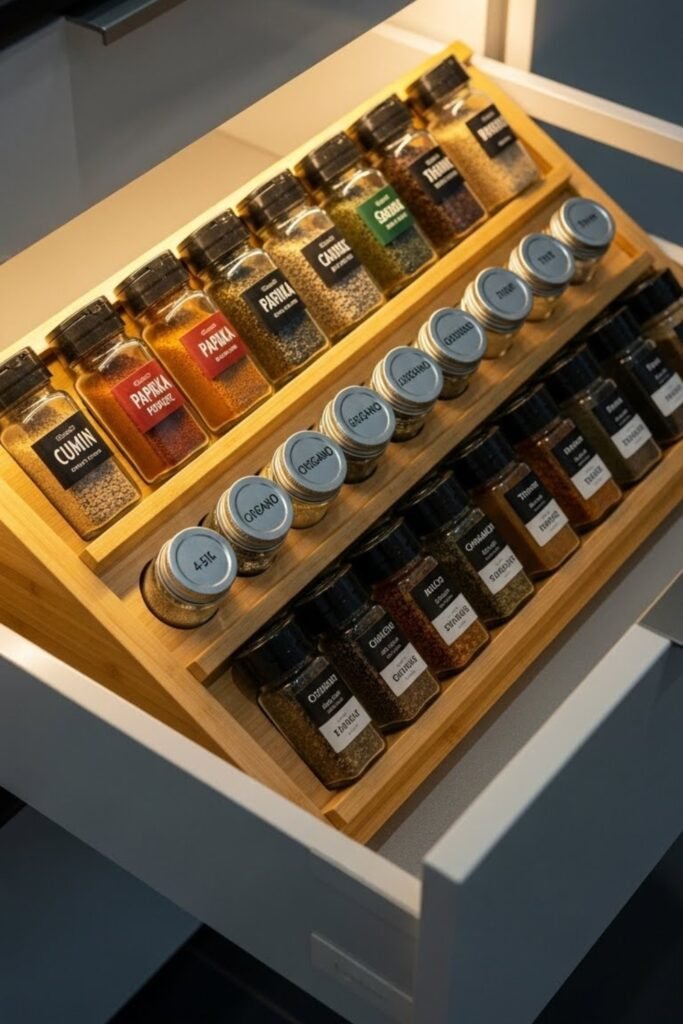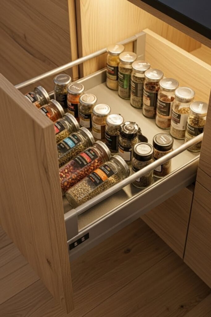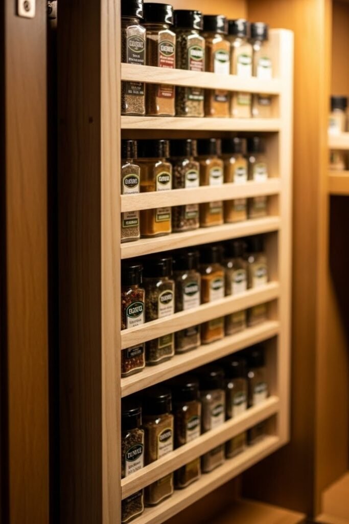 A pull-out spice drawer fits neatly inside lower cabinets or islands. Build a narrow sliding frame with angled or tiered rows so spice labels remain visible.