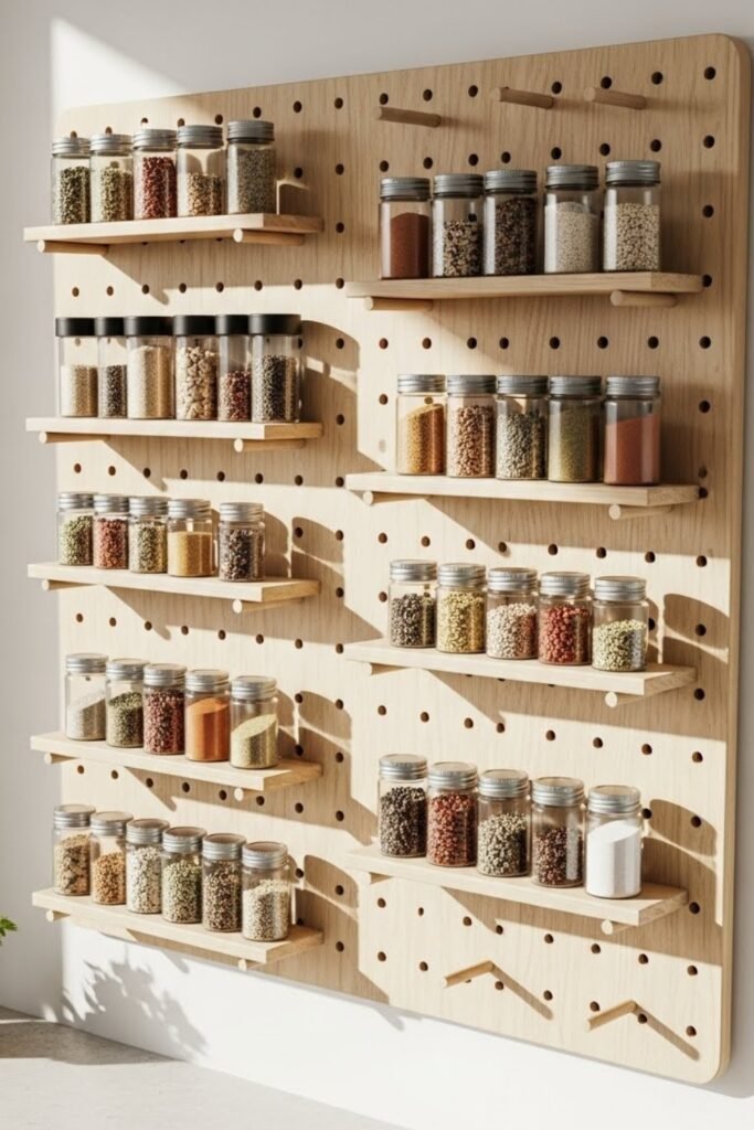 A pegboard spice rack offers a fully customizable storage solution. Attach small shelves, hooks, or holders to a wall-mounted pegboard.