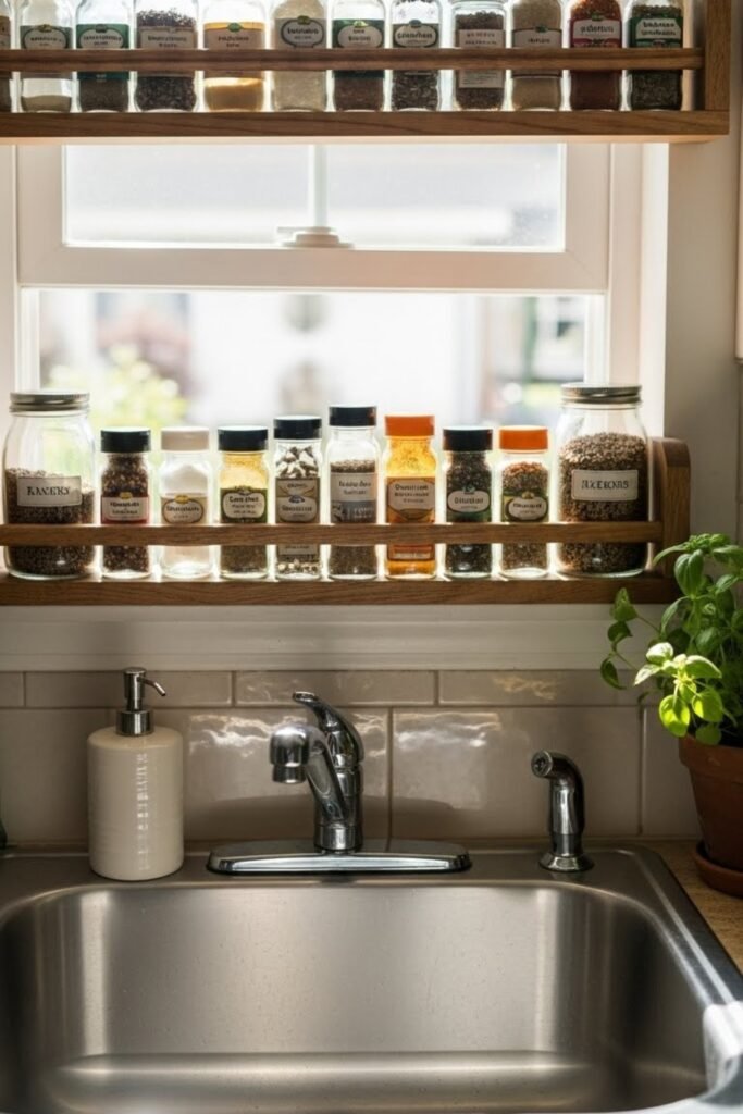 An over-sink spice shelf uses the unused space above the sink area. Build a narrow wooden or metal shelf that spans the window frame or wall.
