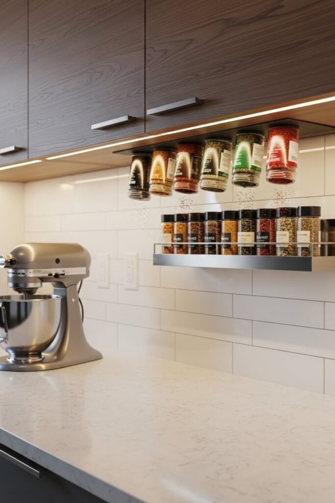 An under-cabinet spice rack mounts directly beneath upper cabinets. Use slim shelves or hanging rails to store spice jars upside down or upright.