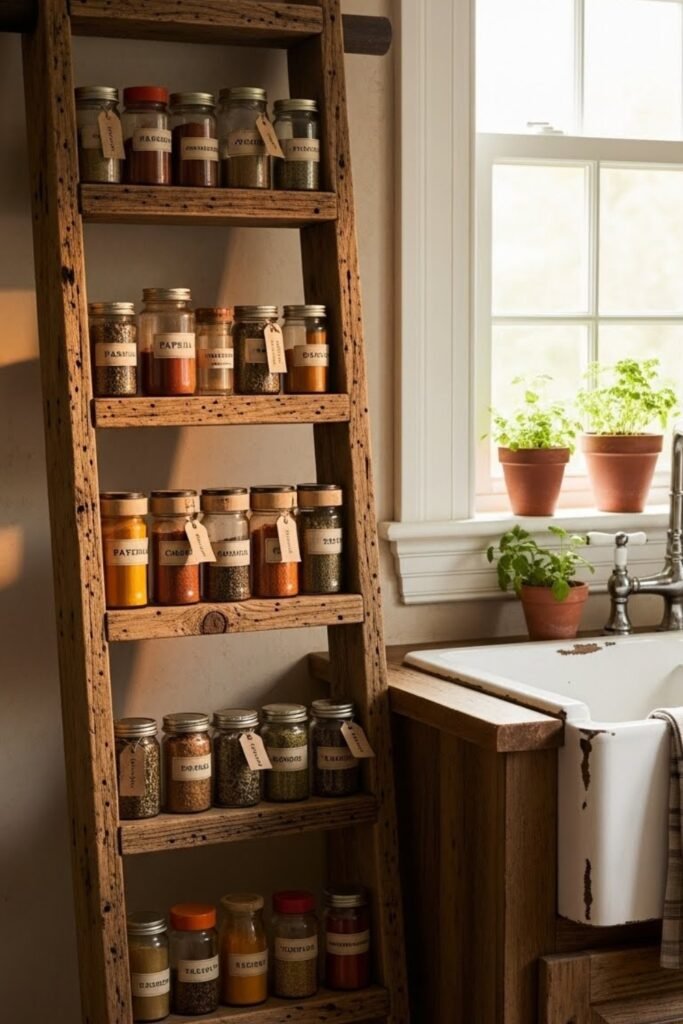 A ladder-style spice rack uses a leaning or wall-mounted ladder frame with narrow shelves. It adds a rustic or farmhouse feel while providing vertical storage.