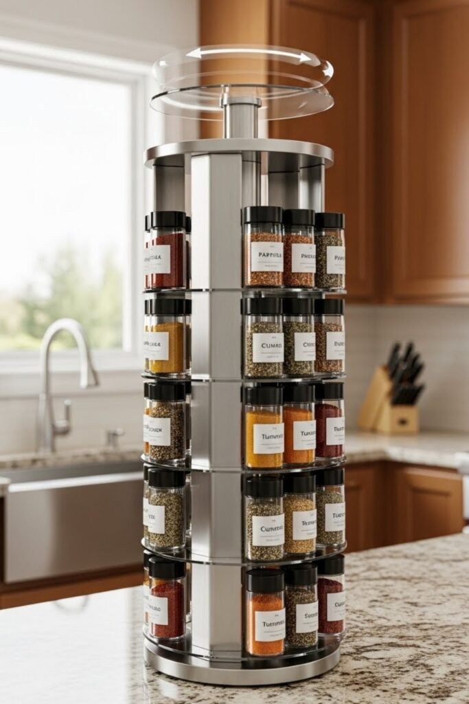 A vertical rotating spice rack uses stacked circular tiers that spin around a central pole. You can build it tall and slim to fit on counters or inside cabinets.