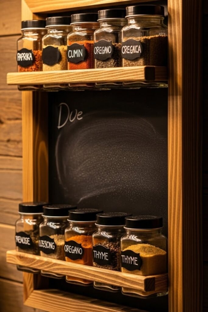 A chalkboard spice rack combines storage with labeling. Build a shallow rack with a chalkboard backing so you can write spice names directly behind jars.