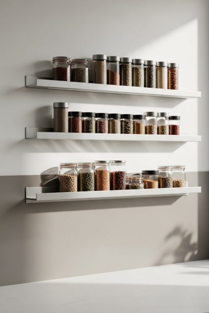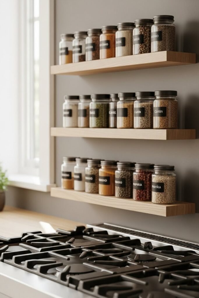 Floating shelves offer a clean and modern spice rack solution. Slim wooden shelves mounted near the stove keep spices within reach while adding warmth to the kitchen.