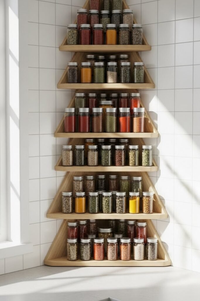 A corner spice rack uses vertical corner space that often goes unused. Build triangular or curved shelves to fit snugly into kitchen corners.