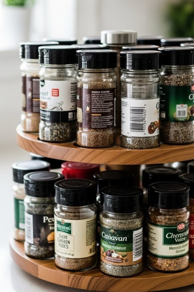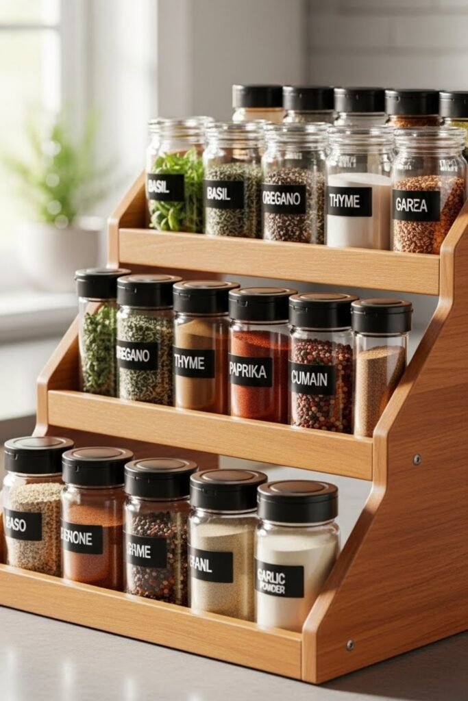 A tiered spice stand sits neatly on the countertop and raises each row for clear visibility. You can build it using wood steps or stacked risers to prevent jars from hiding behind each other.