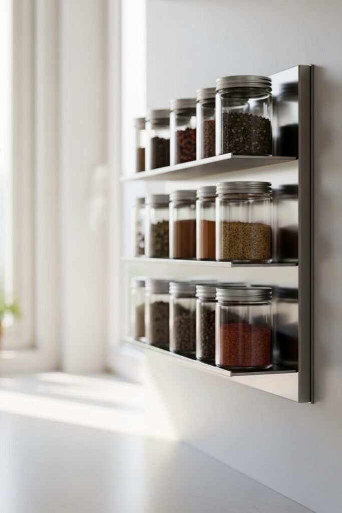 A magnetic spice rack uses metal boards and magnetic jars mounted on the wall or backsplash. It saves cabinet space and creates a bold, modern look.