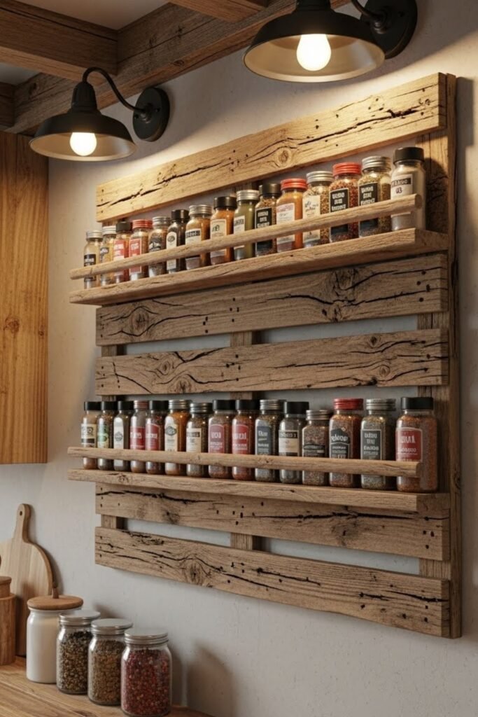 A pallet wood spice rack brings rustic charm to your kitchen. Cut pallet boards into narrow shelves and mount them vertically or horizontally.