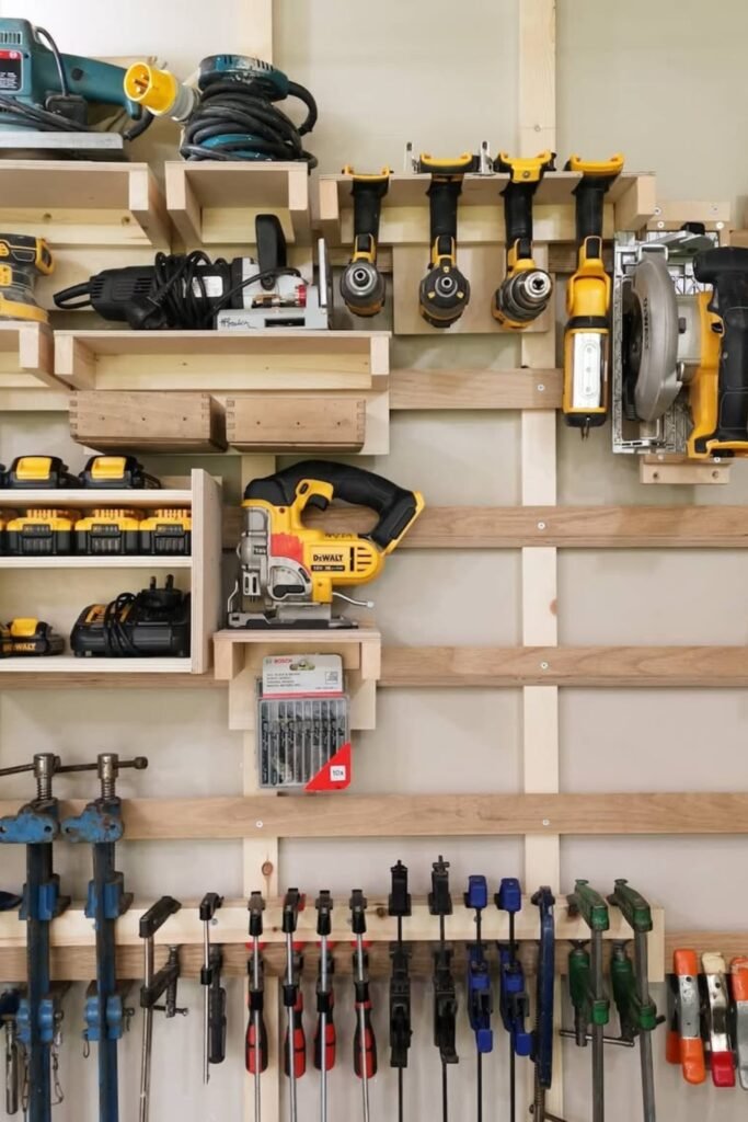 Recreate this setup in any garage needing vertical efficiency, building holders from scrap pieces shaped around your tools for strong personalized storage.