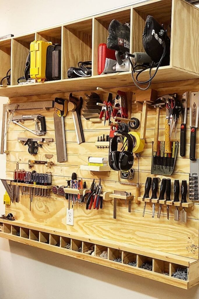 This plywood wall uses slotted rows to position saws, chisels, clamps, and drivers neatly, giving every tool its own anchored position for safer use.