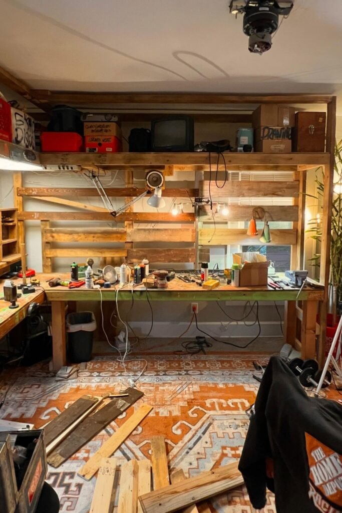 Scrap timber frames create a rustic workstation that holds lamps, shelves, organizers, and tool trays while keeping the workspace grounded with warm character.