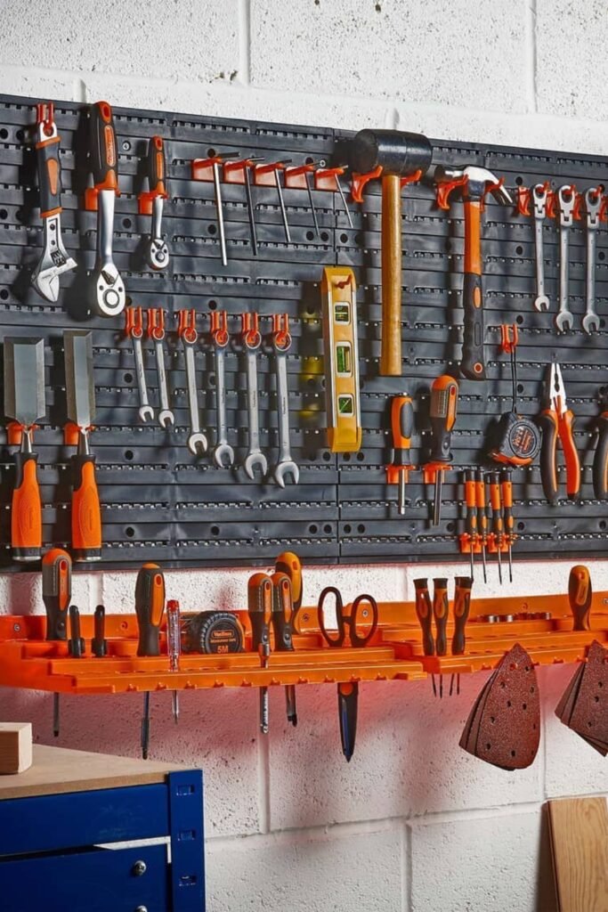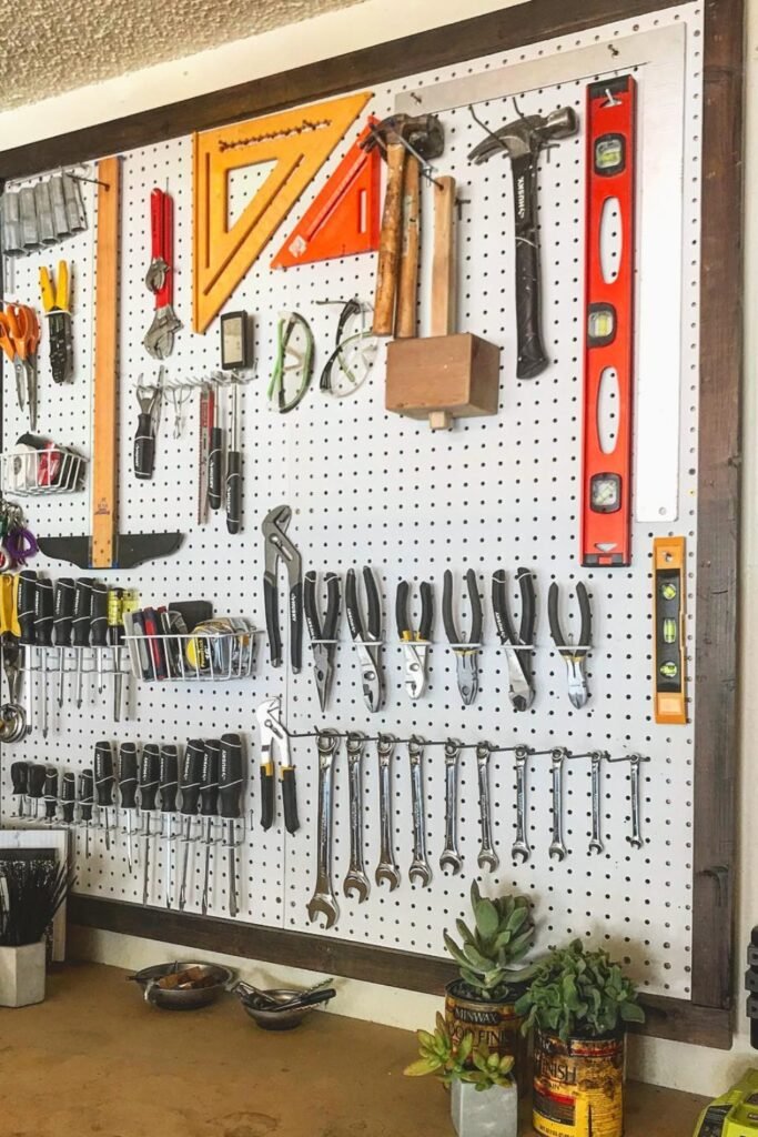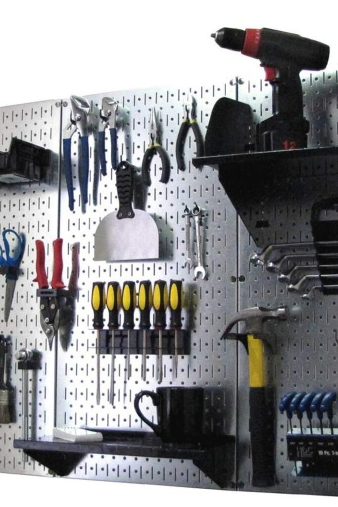 A metal pegboard like this helps you arrange pliers, screwdrivers, wrenches, and drills while keeping every commonly used tool visible.