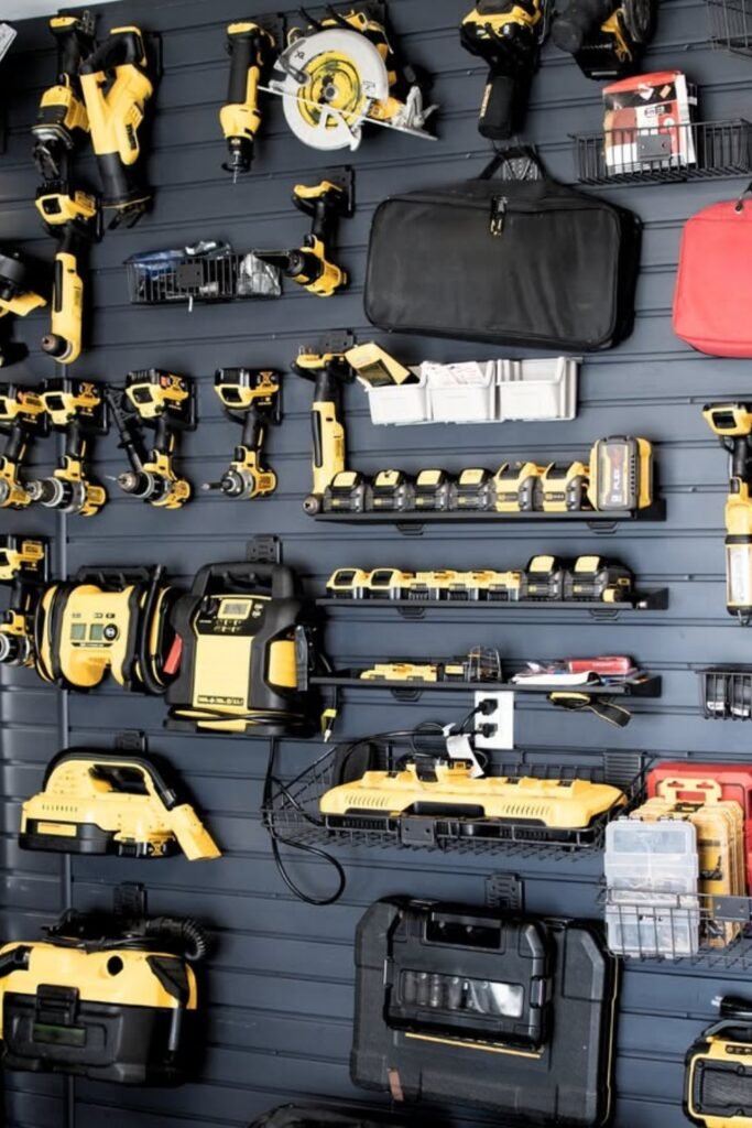 A slatwall system lets your power tools hang securely, giving drills, saws, sanders, and lights clear placement without clutter appearing.
