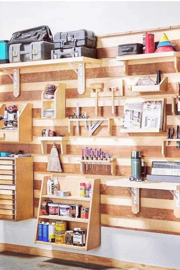 Striped cleats create a modular wall that positions shelves, bins, holders, and hand tools neatly, helping every project start organized.