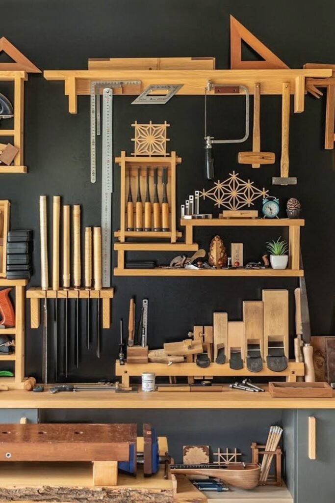 This woodworking wall highlights chisels, planes, squares, and delicate shaping tools, giving each piece stable spacing suitable for refined craftsmanship.