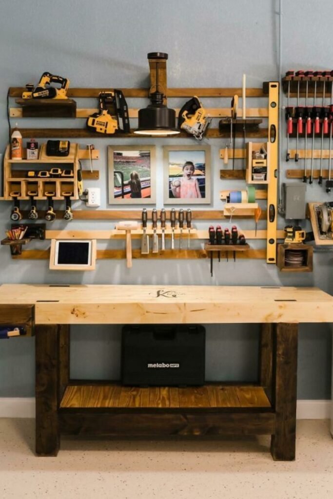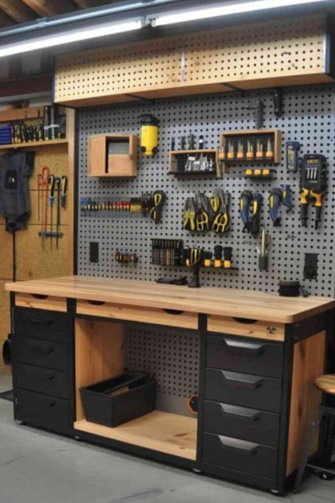 A tall pegboard behind the bench helps you separate drivers, clamps, snips, and bits, keeping everything reachable during woodworking sessions.