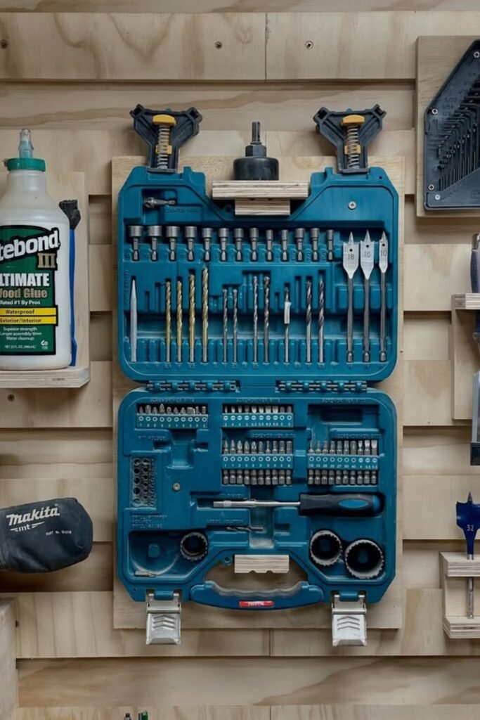 Mounting a drill-bit case directly onto a cleat wall keeps every bit organized, using two lower catches and a centered top bracket for stability.
