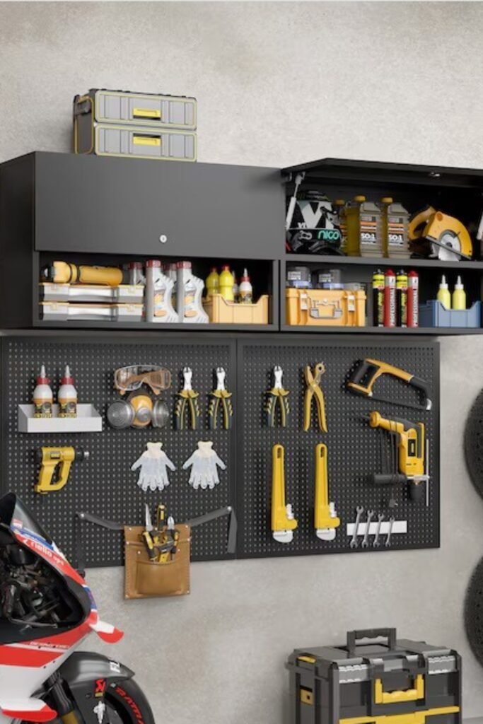 Blending cabinets with pegboard gives you a protected zone for chemicals and power tools while keeping daily hand tools instantly reachable below.