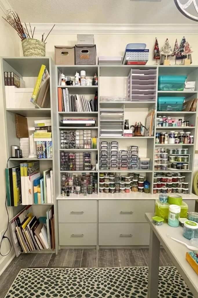 This shelving grid turns every craft supply into a sorted section, keeping paints, glitters, brushes, tools, and paper trays visible during project planning.