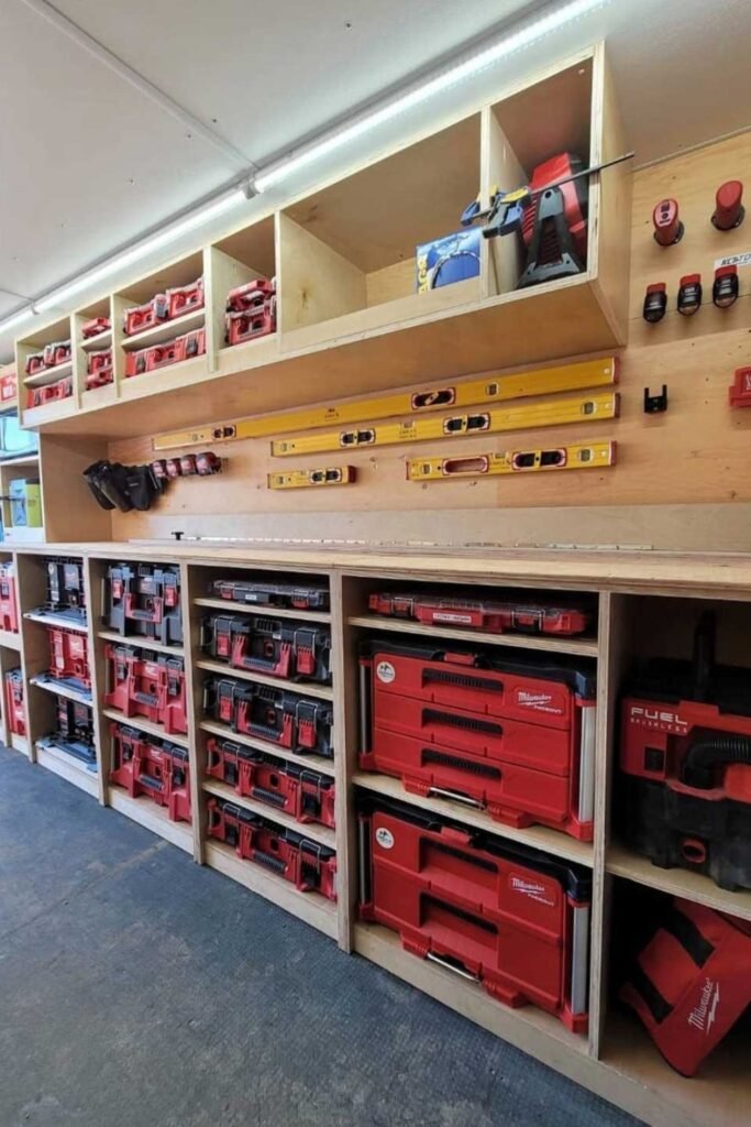 Dedicated shelves for cases and measuring tools help you build a working wall that protects Milwaukee boxes while displaying every essential level cleanly.