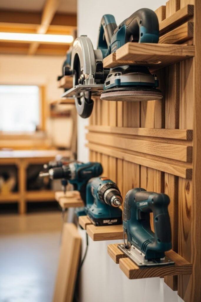 This setup works great for heavier tools like drills and saws. It keeps tools visible, accessible, and safely supported while allowing you to customize the layout over time.