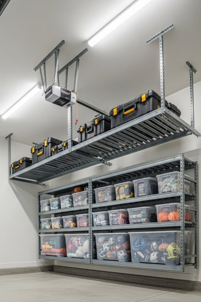 This keeps bulky items off the floor while still accessible when needed. It’s especially useful in tight garages where wall and floor space are limited.