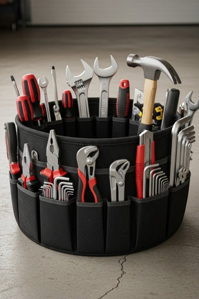 A bucket organizer keeps hand tools upright and easy to carry. You can use fabric pockets or DIY wooden inserts inside a standard bucket.