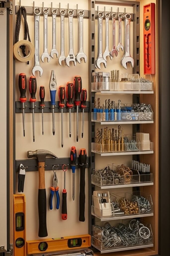 A door organizer turns unused door space into tool storage. Mount hooks, small bins, or narrow shelves on the inside of cabinet or room doors.