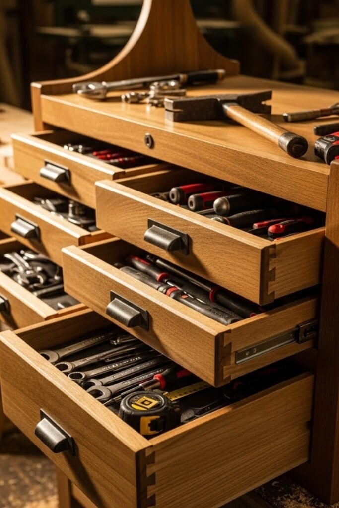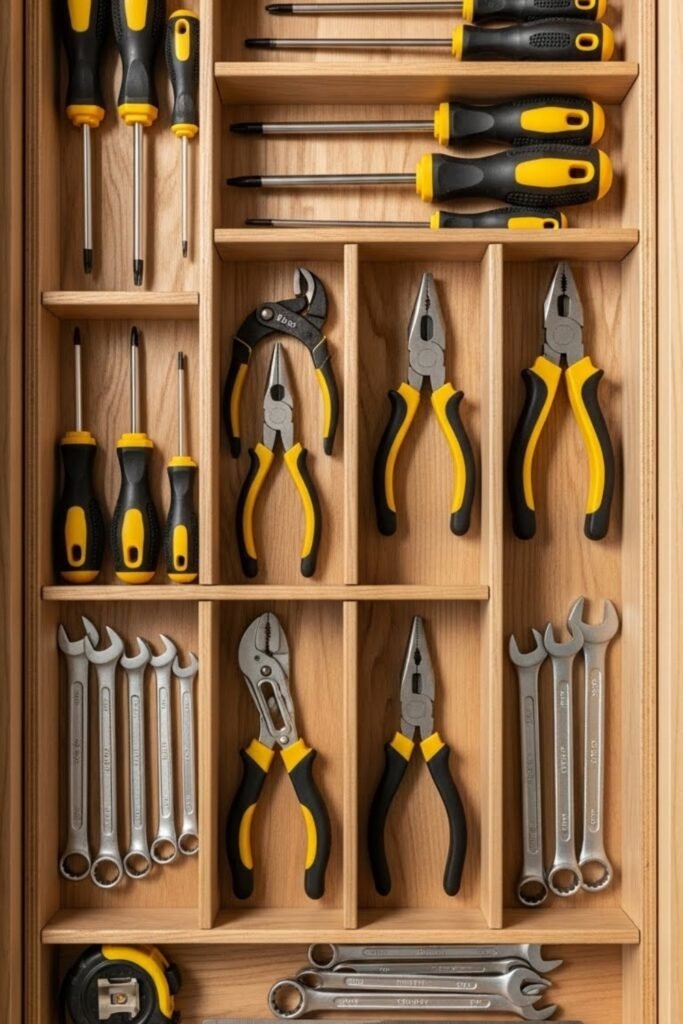 Custom drawer dividers help separate small tools like screwdrivers, pliers, and measuring tools. You can build them using wood scraps or foam inserts.