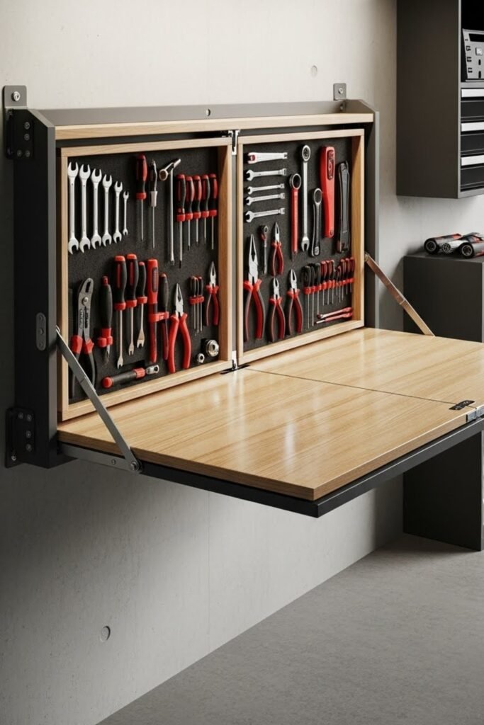 A fold-down bench combines workspace and tool storage in one compact design. When folded up, it frees floor space and hides tools behind panels or shelves.
