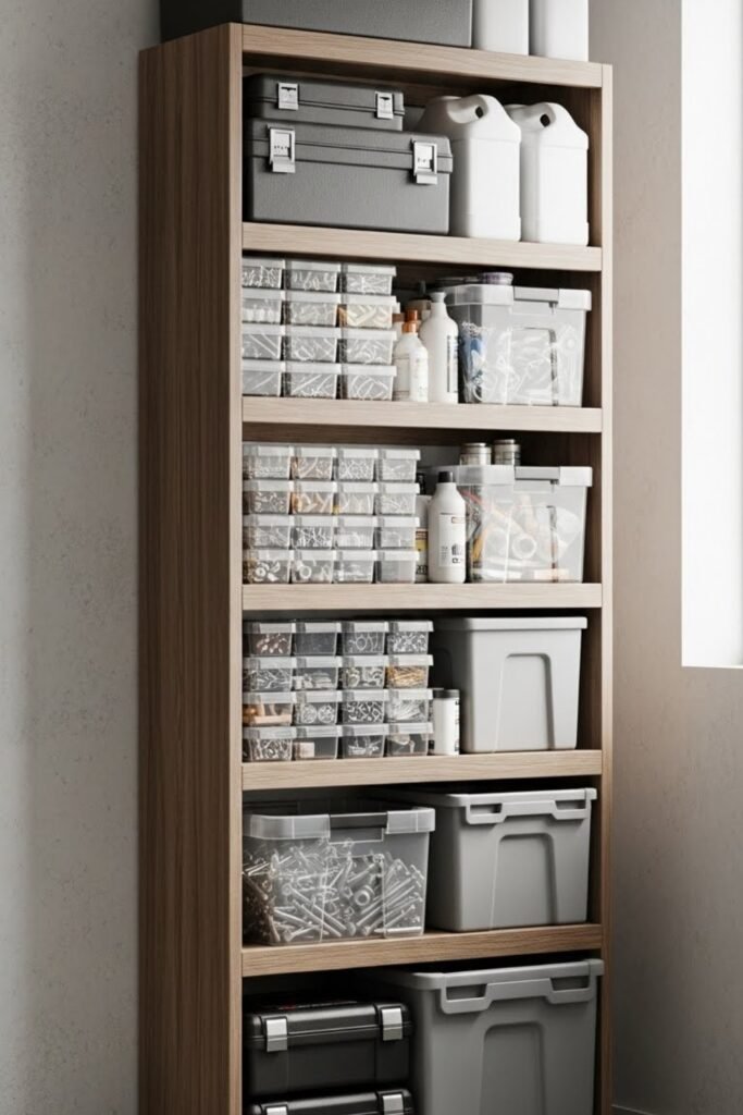 Vertical shelving takes advantage of wall height instead of floor space. Tall, narrow shelves can store tool cases, bins, and supplies without crowding your workspace.