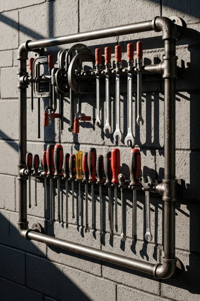 A pipe rack uses metal or PVC pipes to create sturdy tool holders. You can mount pipes horizontally or vertically to store clamps, bars, or long tools.