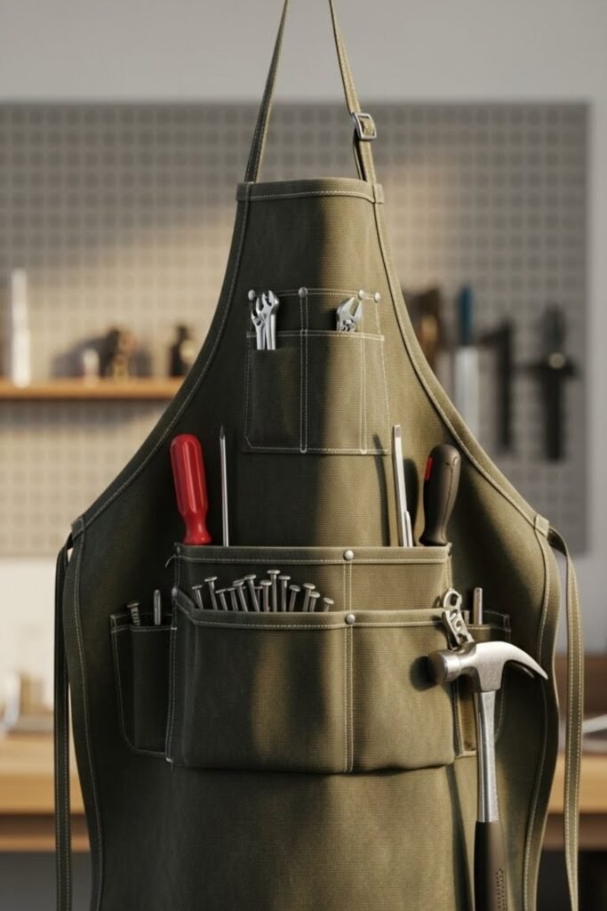 A tool apron keeps frequently used tools on your body while working. Add custom pockets for screwdrivers, nails, and small parts. You can hang the apron on a hook when not in use.