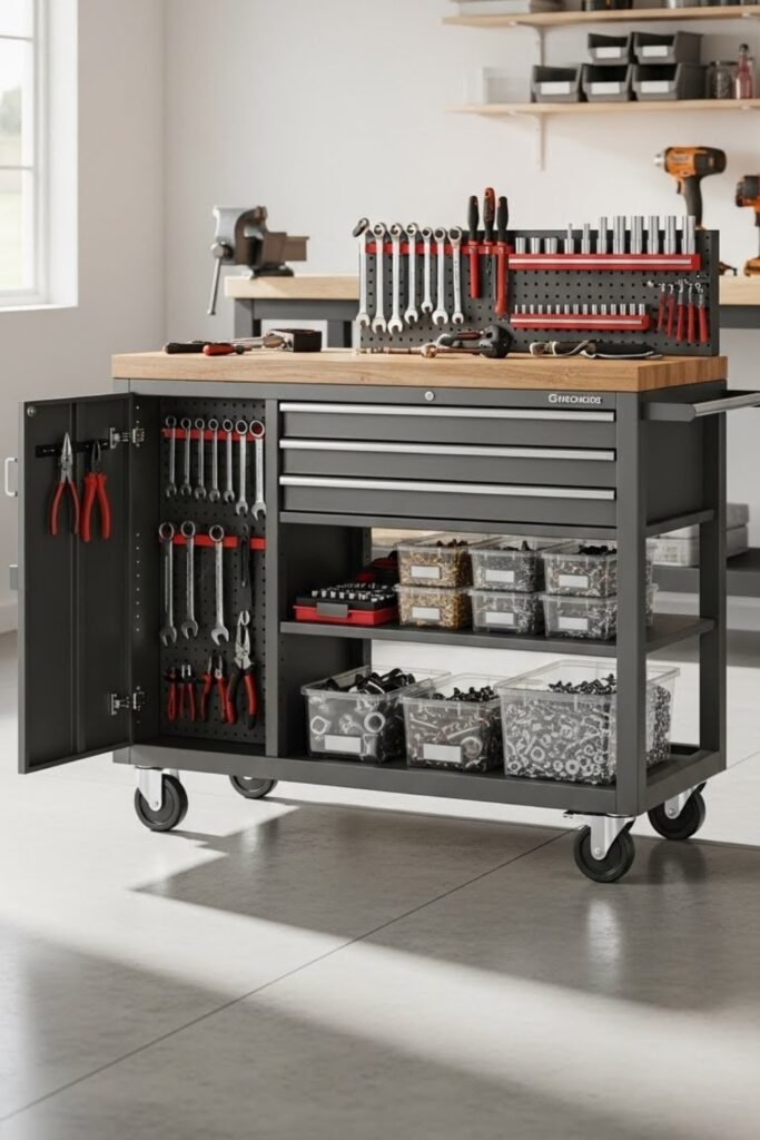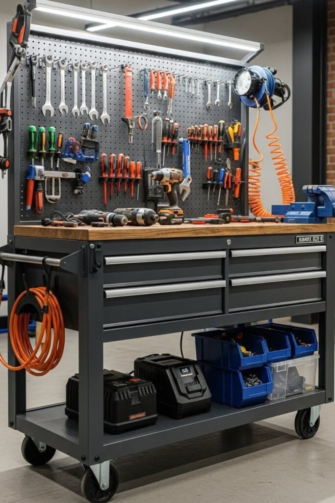 A mobile workstation combines storage and workspace on wheels. Include shelves, pegboards, and drawers to organize tools efficiently.