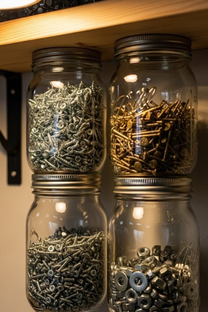 Mason jars mounted under shelves are perfect for storing screws, nails, and small hardware. You can label each jar for quick identification.