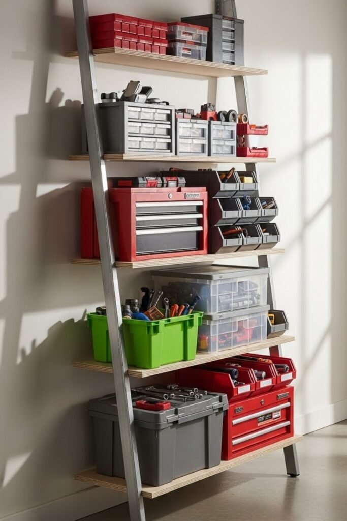 A ladder-style shelf leans against the wall and offers tiered storage for tools and bins. Each level can hold toolboxes, paint cans, or supplies.