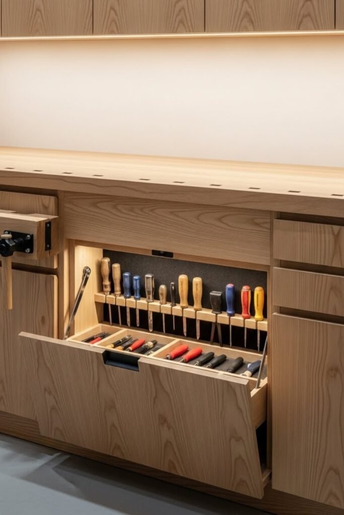 This keeps frequently used tools easy to grab while staying out of sight. It’s a great option for compact workshops or shared spaces.