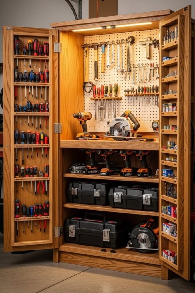 A DIY tool cabinet keeps everything hidden, dust-free, and organized. You can add shelves, pegboard panels, or door-mounted racks inside the cabinet for maximum storage.