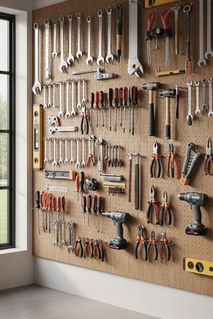 A pegboard wall turns empty wall space into flexible tool storage. You can hang hand tools, power tools, and accessories using hooks, baskets, and shelves.