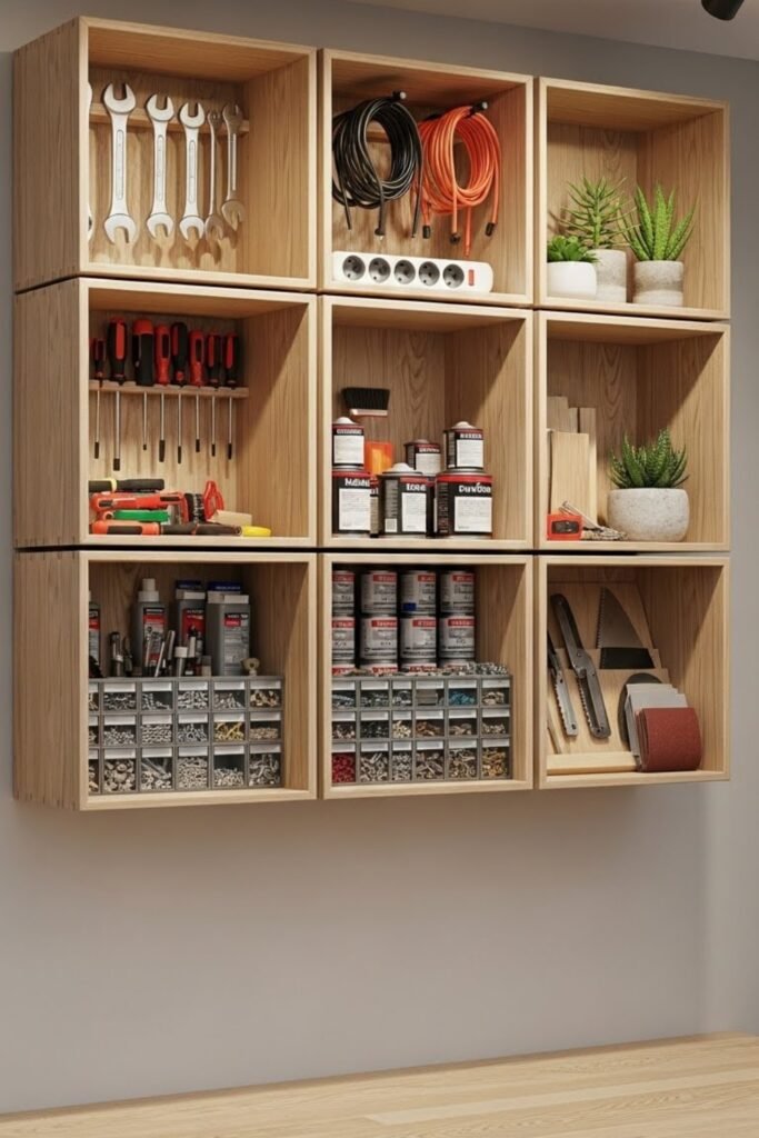Wall-mounted storage cubes create dedicated spots for different tools and supplies. Each cube can hold a specific tool type, making organization easy to maintain.