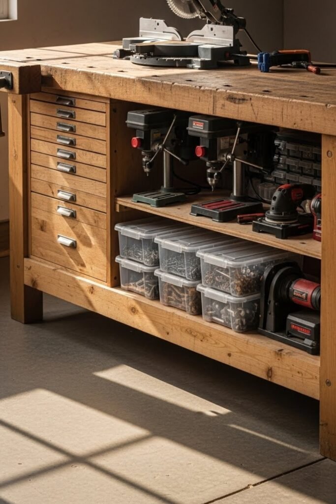 Using the space under your workbench helps keep tools organized without taking up wall space. Add drawers, sliding bins, or shelves to store power tools and supplies.