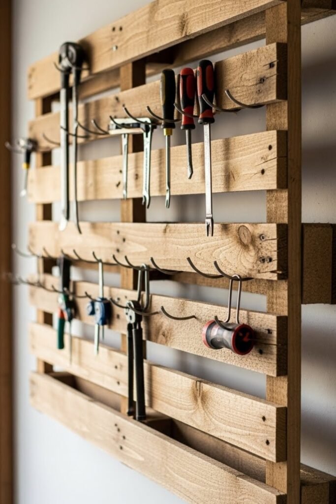 A pallet rack made from reclaimed wood creates sturdy tool storage with a rustic look. You can mount tools directly onto the pallet or add hooks and shelves.