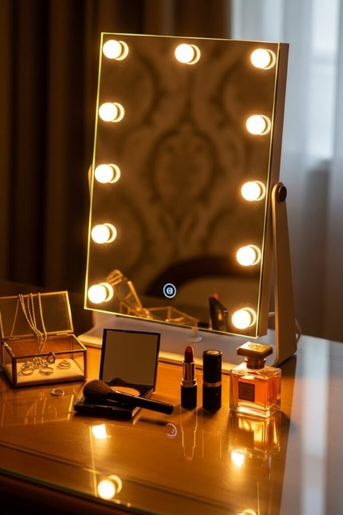 A desk mirror vanity sits directly on the table with lights attached around the frame. This is easy to build and does not require wall mounting.