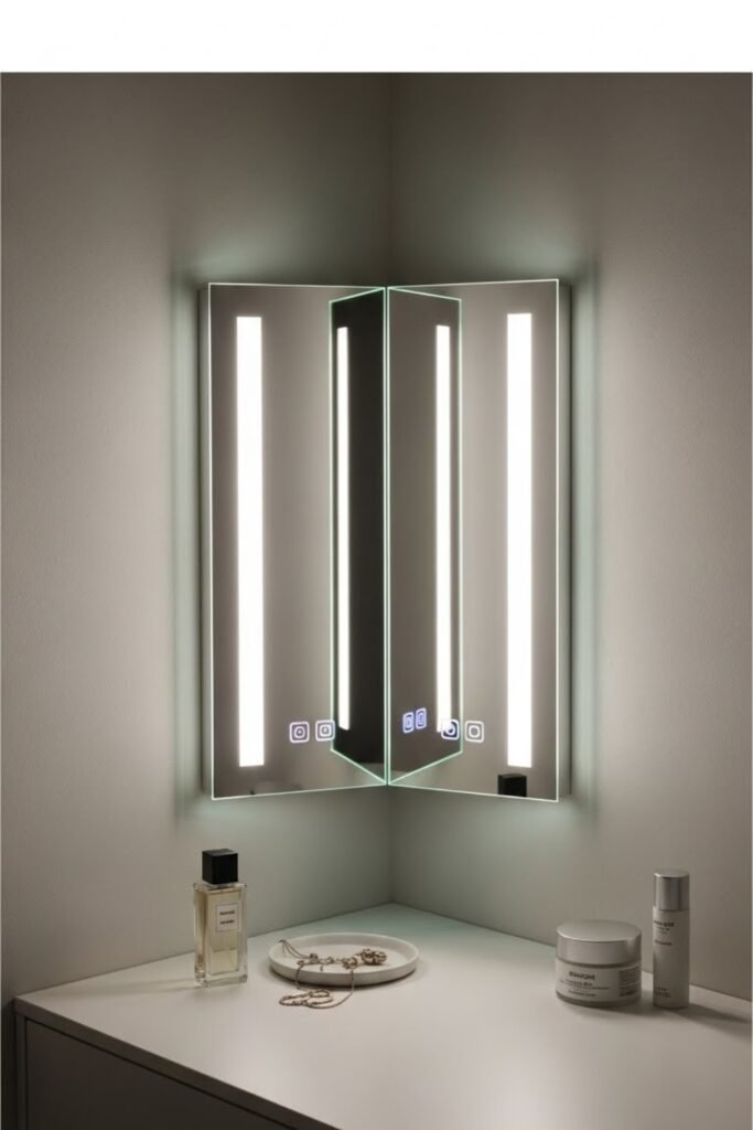 A corner setup vanity mirror is designed to fit neatly into a room corner. Lights can be installed along both sides of the mirror to evenly light the face.