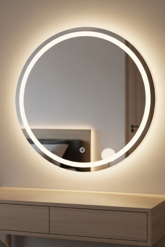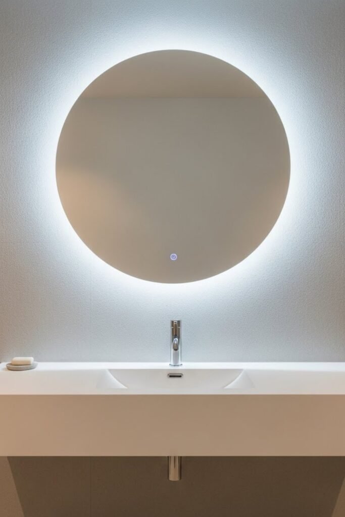 A round mirror vanity with lights adds a soft, stylish touch to the space. LED strips or small bulbs can be placed around the edge for even lighting.