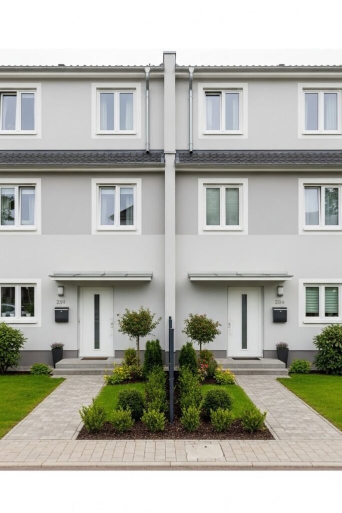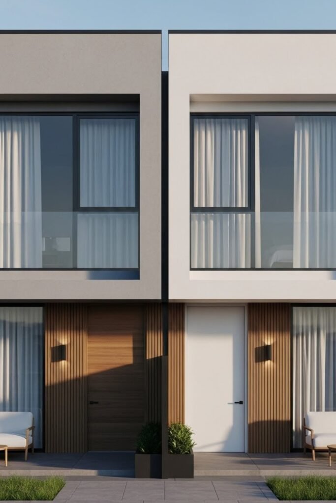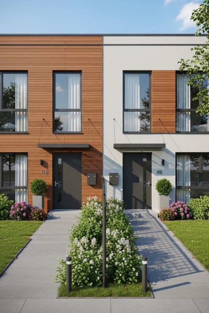 Each unit has a separate entrance, utilities, and outdoor area, while the shared wall reduces construction costs without affecting comfort.